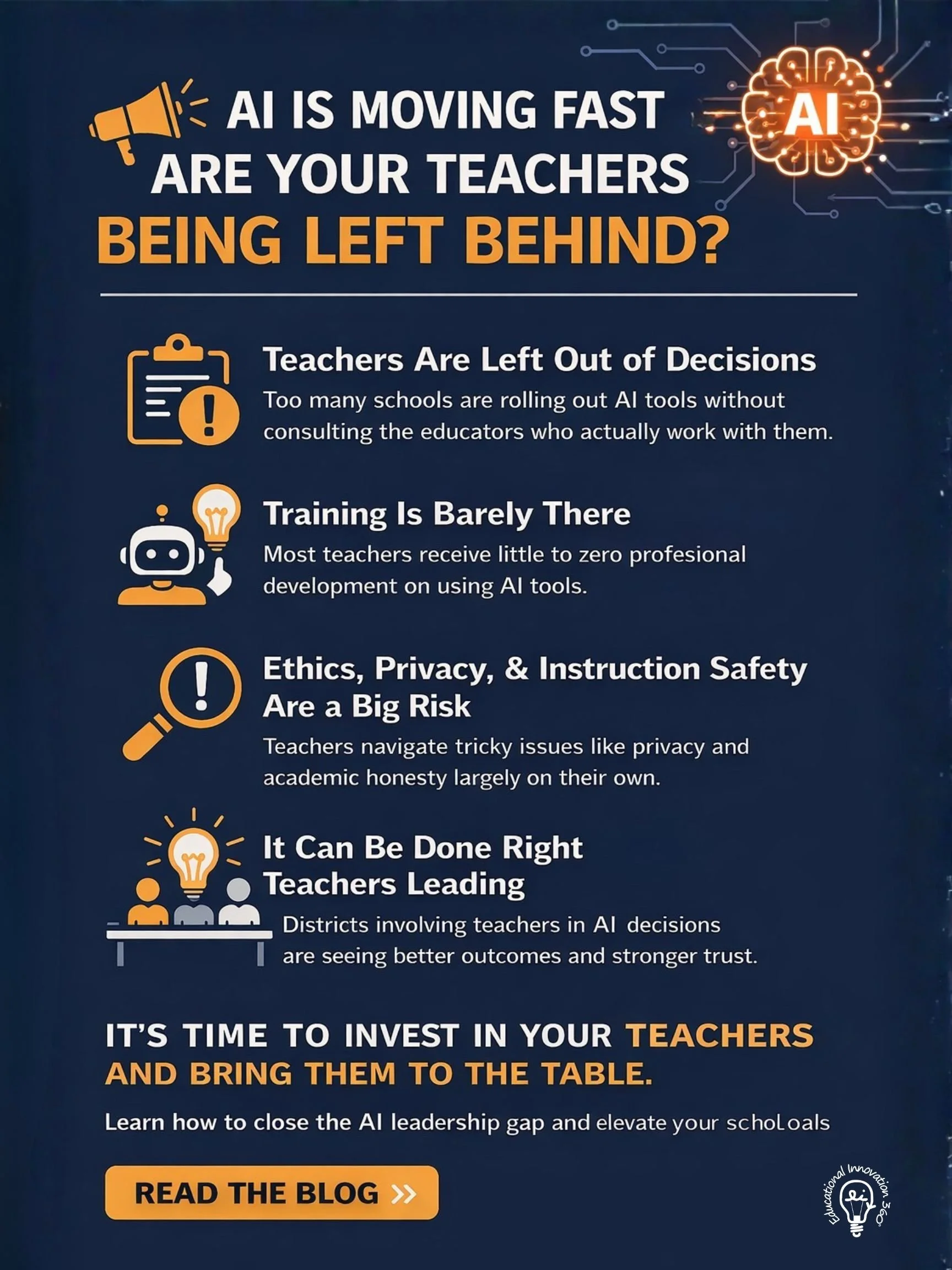 At Educational Innovation 360, our work lives inside one central question every day: How do we ensure innovation actually strengthens teaching and learning rather than complicating it? This question shows up most clearly in our work with reading instruction and teacher development. What we are seeing in AI rollouts mirrors a pattern we have observed for years in curriculum adoption. When teachers are not consulted during implementation, even strong tools are used inconsistently, and it is often the students who need the most support who feel the consequences of that inconsistency.